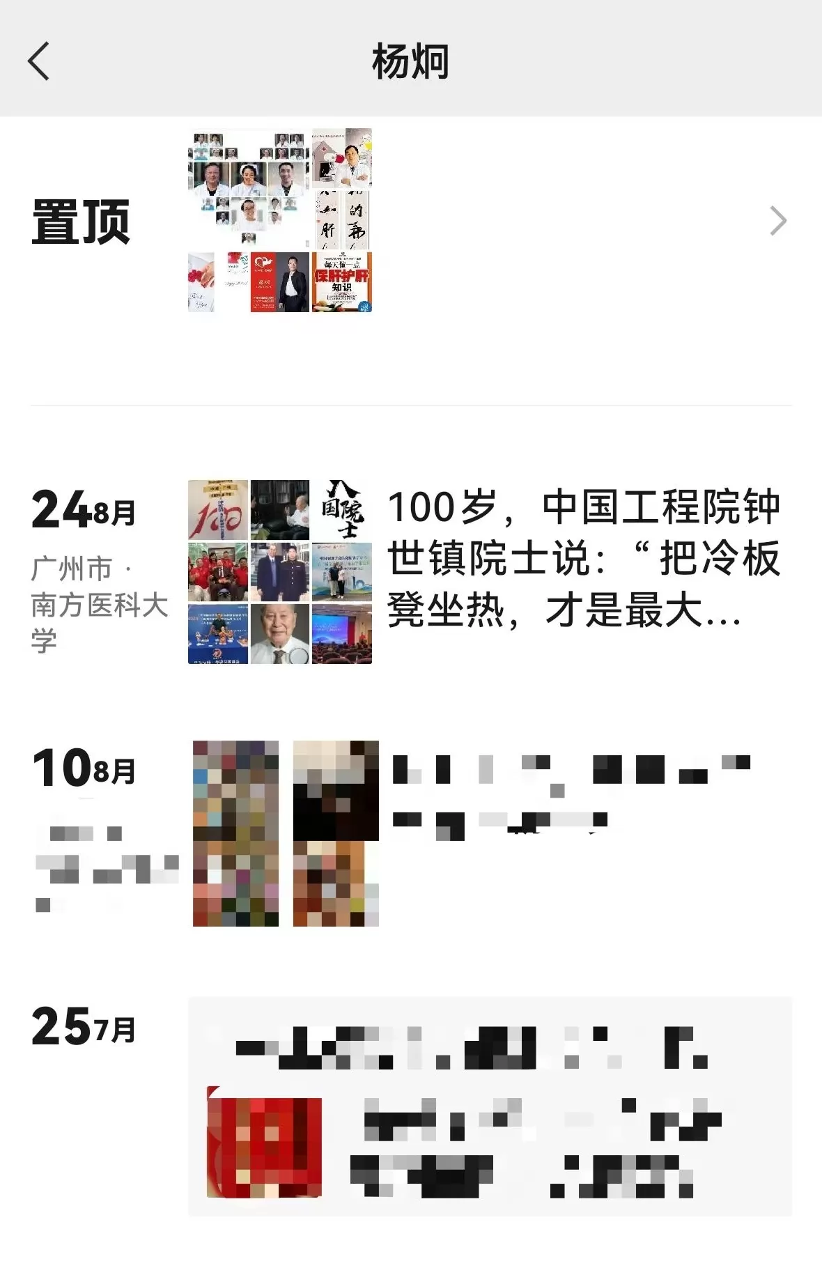 新京报记者获取到一份杨炯当天发布的朋友圈截图,其部分内容显示为“100岁,中国工程院钟世镇院士说:‘把冷板凳坐热,才是最大...’”,同时配以九张照片。杨炯解释,该朋友圈文案引用钟院士名言“把冷板凳坐热,才是最大的本事”,九张照片分别为会议纪念帆布包照片、现场拍摄的五人与钟院士合影、“航天英雄”杨利伟与钟院士合影照片、其与妻子在会场展牌前照片、其站在“中国解剖学会行业标准制定起草单位”展牌前照片、网络照片及会议现场照片等。