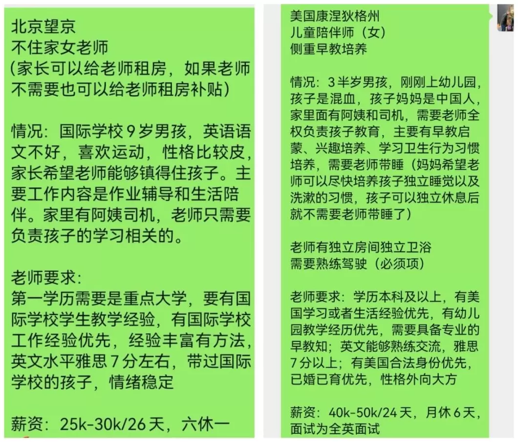 “月薪3-8万,国内985/211或海外名校毕业,包吃包住,负责儿童的高端陪伴与早教启蒙,英文好,最好有美术、音乐、户外高尔夫、骑马等特长……”