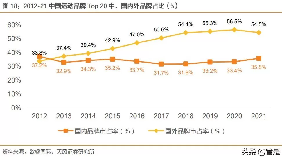 海外品牌份额萎缩,国产品牌加速崛起。随着“Z 世代”人群逐渐成为消费主力,国民的民族凝聚力与认同感进一步增强。2021 年 3 月“新疆棉”事件爆发,国外品牌的无理抵制 激发国民爱国情怀,国产运动品牌普遍快速崛起。根据欧睿国际,从中国市场运动品牌 Top20 看,海外品牌近年份额萎缩,国内品牌市占率呈稳步上升趋势,2018-2021 年国牌 份额由 31.8%增长至 35.8%。