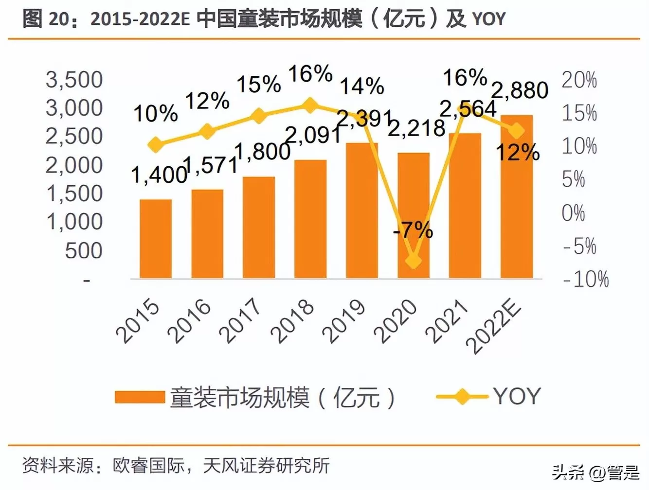 童装市场持续双位数增长,运动品牌渗透率提升。根据欧睿国际,2021 年中国童装市场规 模达 2564 亿元,同比增长 16%;预计 2022 年童装市场持续向好,规模将达 2880 亿元, 同比增长 12%。其中,运动品牌在童装市场渗透率不断提升,2021 年,安踏、阿迪、耐克、 Fila、李宁、361°等运动品牌在童装市场占比达 5.1%。 放宽生育政策,倡导素质教育,为儿童体育行业带来更大发展潜力。继二孩政策全面落地 实施之后,国家出台三孩生育政策及相关配套措施,为中国童装市场维持高景气度提供有 力支持。根据欧睿国际预计,2021 年至 2025 年中国童装市场规模的复合增长率达到 10.63% 以上。此外,2021 年 7 月,国家出台“双减”政策,提出要合理利用学生的课余时间,开 展适宜的体育锻炼,促使青少年体育需求升温,有助于形成体育用品消费的新增长点。