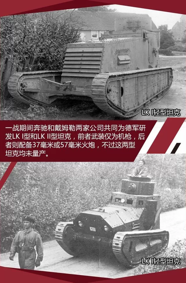 第一次世界大战开始后,奔驰和戴姆勒两家公司为德军提供了大量的运输车辆,除了运输车外,这两家公司还参与研制了两款轻型坦克LK I和LK II型,这是德军为扭转战局所做的努力之一,计划制造580辆但是直到战争的结束也才生产出两辆原型车。