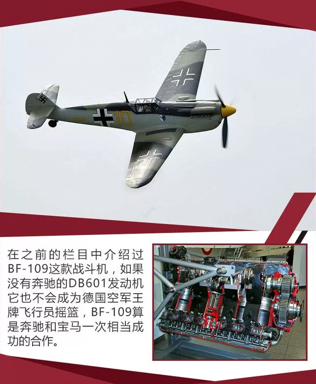 除了地面载具之外,戴姆勒-奔驰公司另一个重要领域就是飞机发动机,二战中德军主力战机、由巴村飞机制造厂(巴伐利亚飞机制造厂)制造的BF-109系列战斗机搭载的都是戴姆勒-奔驰公司提供的DB600系列发动机。其中DB601发动机就是一款划时代产品,它比原先搭载在BF109上面的容克210发动机功率高出快一倍,达到了1050马力,而容克210只有605马力。DB601发动机另一个突破性设计就是供油方式从化油器变成直接喷射(是现在歧管喷射和缸内直喷的雏形),这非常有利于飞机在空中做机动动作,而装配化油器供油方式发动机的飞机在做机动动作时就要面临因液面变化而无法将油抽取上来进而导致发动机熄火的风险,这种空中“停车”的情况相当危险,驾驶员说死就死。