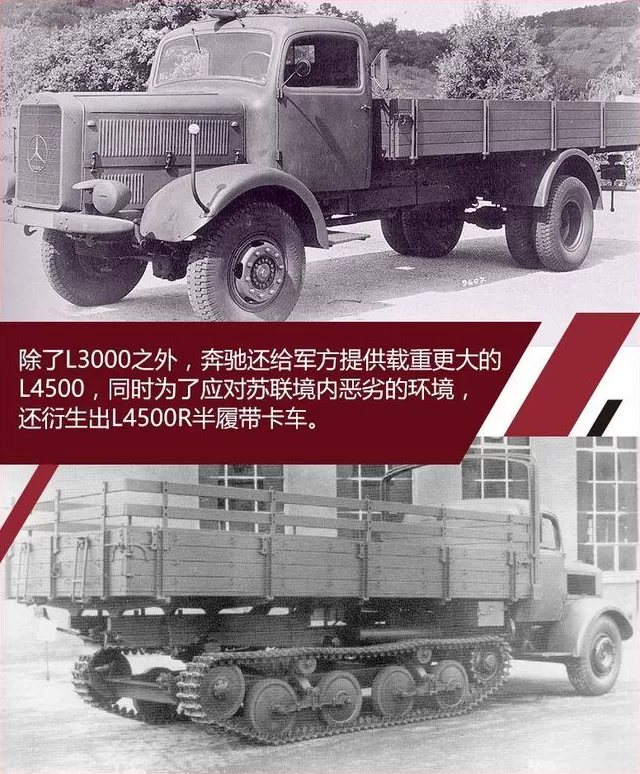 不过戴姆勒-奔驰公司的重头戏是在轮式车辆上,其中L3000卡车是它在战争期间中生产最多的车辆,达到了27000辆。此外戴姆勒-奔驰公司还生产L4500重型卡车,对苏战争开始后,为了应对冬季冰雪造成的路面泥泞的情况,L4500重型卡车还发展出了L4500R半履带式的型号,能拉着4吨半的物资在非铺装的地面上最远行驶100公里,成为东线作战的德军中不折不扣的驿马。