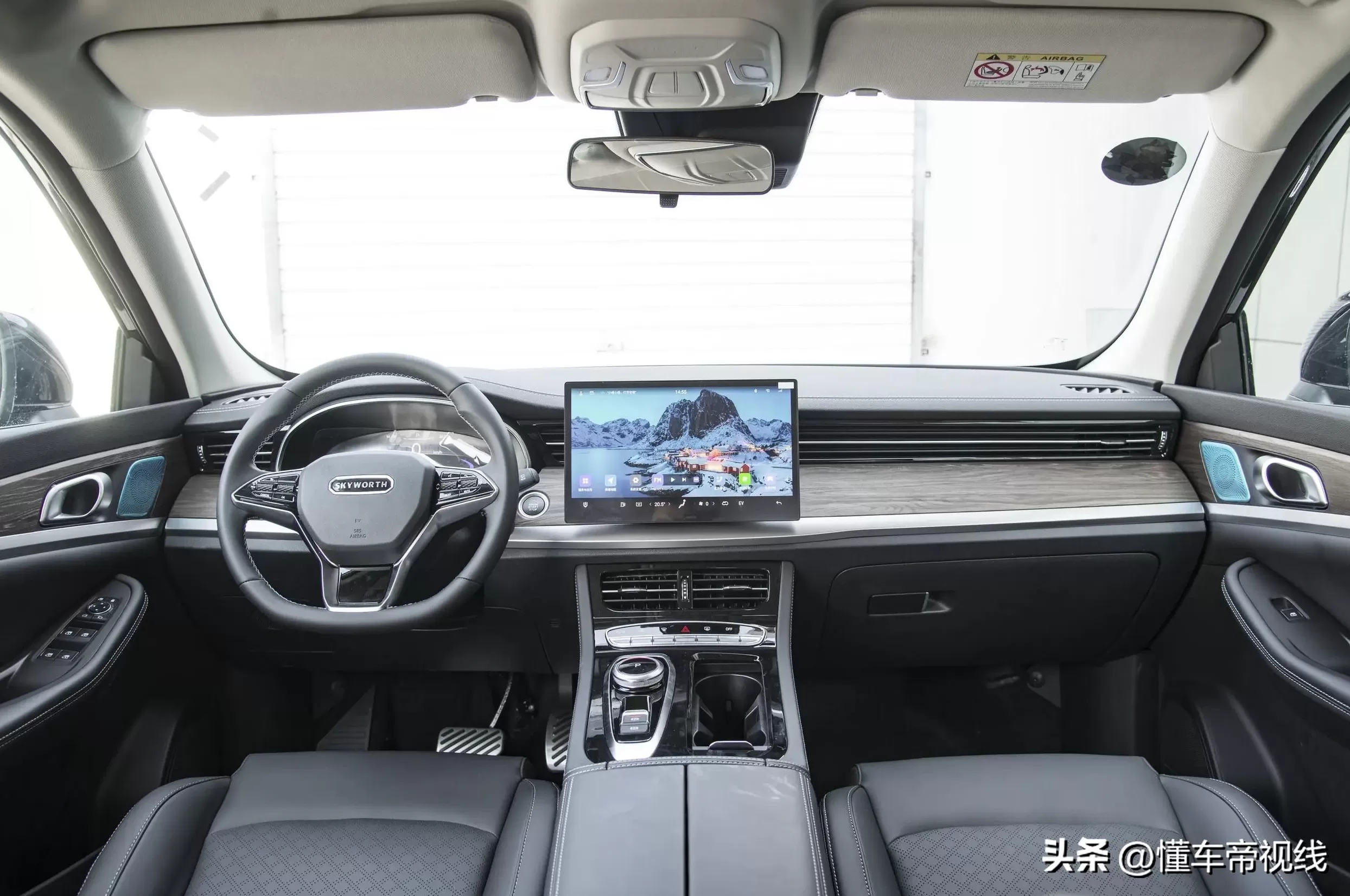 内饰部分,参考2024款创维EV6极行版,采用对称式设计布局。此次上市的闪现版+提供12.3英寸液晶仪表、三辐式方向盘、15.6英寸悬浮式中控屏幕和旋钮换挡等元素。