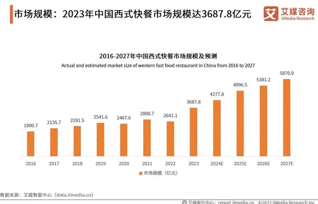 随着生活节奏的加快,西式快餐以方便、快捷、省力及美味的特点,日益受到人们的青睐。iiMedia Research(艾媒咨询)数据显示,2023年中国西式快餐市场规模为3687.8亿元,预计2025年有望达到4996.5亿元,西式快餐市场具有较大的发展空间和潜力。