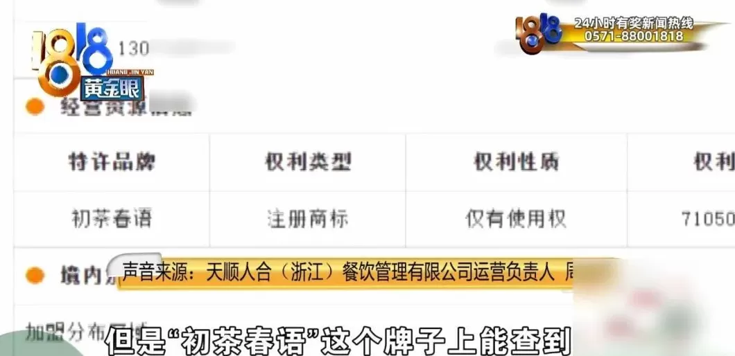 天顺人合(浙江)餐饮管理有限公司运营负责人 周经理 :这个具体的是怎么一个关系,这个东西我就说不太清了。但是“初茶春语”这个牌子上能查到,“初茶春语”这个是真实的。