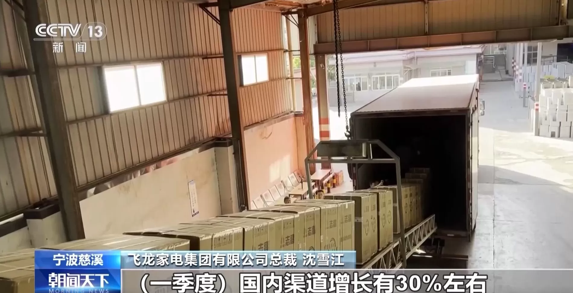 飞龙家电集团有限公司总裁 沈雪江: 我们每天都有货发往上海、北京、郑州这些地方。由于国补政策,一季度国内渠道增长有30%左右。