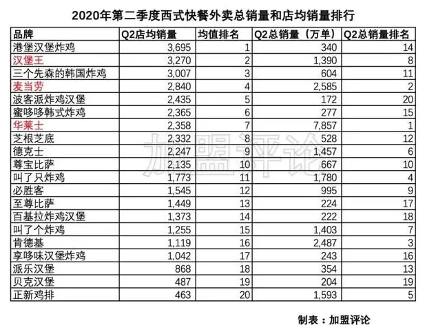 西式快餐外卖的总体情况和上次加盟评论做的《2020年第二季度快餐外卖排行》 一样,已经相对固化,尽管都位于西式快餐总销量的TOP20,大家都已经足够优秀,但优秀之中又分成了4个梯队。而且每个梯队都秩序井然,想进入上一层很难,但相对下一层优势又很明显。