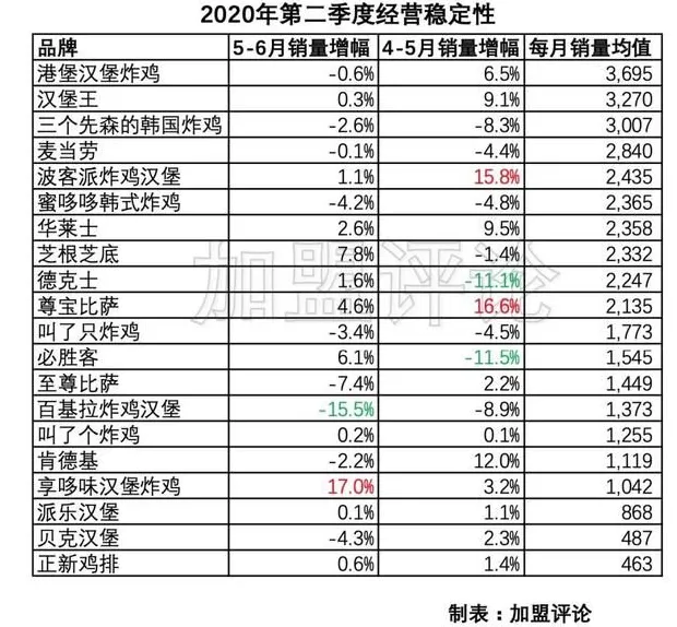 第一梯队:港堡汉堡炸鸡、汉堡王、三个先森的韩国炸鸡和麦当劳。 汉堡王和麦当劳各方面的数据都比较优秀,只是在4-6月份门店总量上没有增加,对于一个加盟品牌来说这意味着在放弃加盟费利润。港堡汉堡炸鸡和三个先森的韩国炸鸡都以外卖为主。三个先森的韩国炸鸡在本季度的门店增长率排行第一,再加上优秀的店均销量意味着加盟商对它的认可度正处在高位,但它的经营稳定性上连续出现轻微下滑这是值得再观察一两个月的。而排名第一的主打外卖的港堡汉堡炸鸡在店均排名上非常出色,但在门店增长率上却和堂食、外卖占比很高的汉堡王和麦当劳相似,这也是值得再观察的。