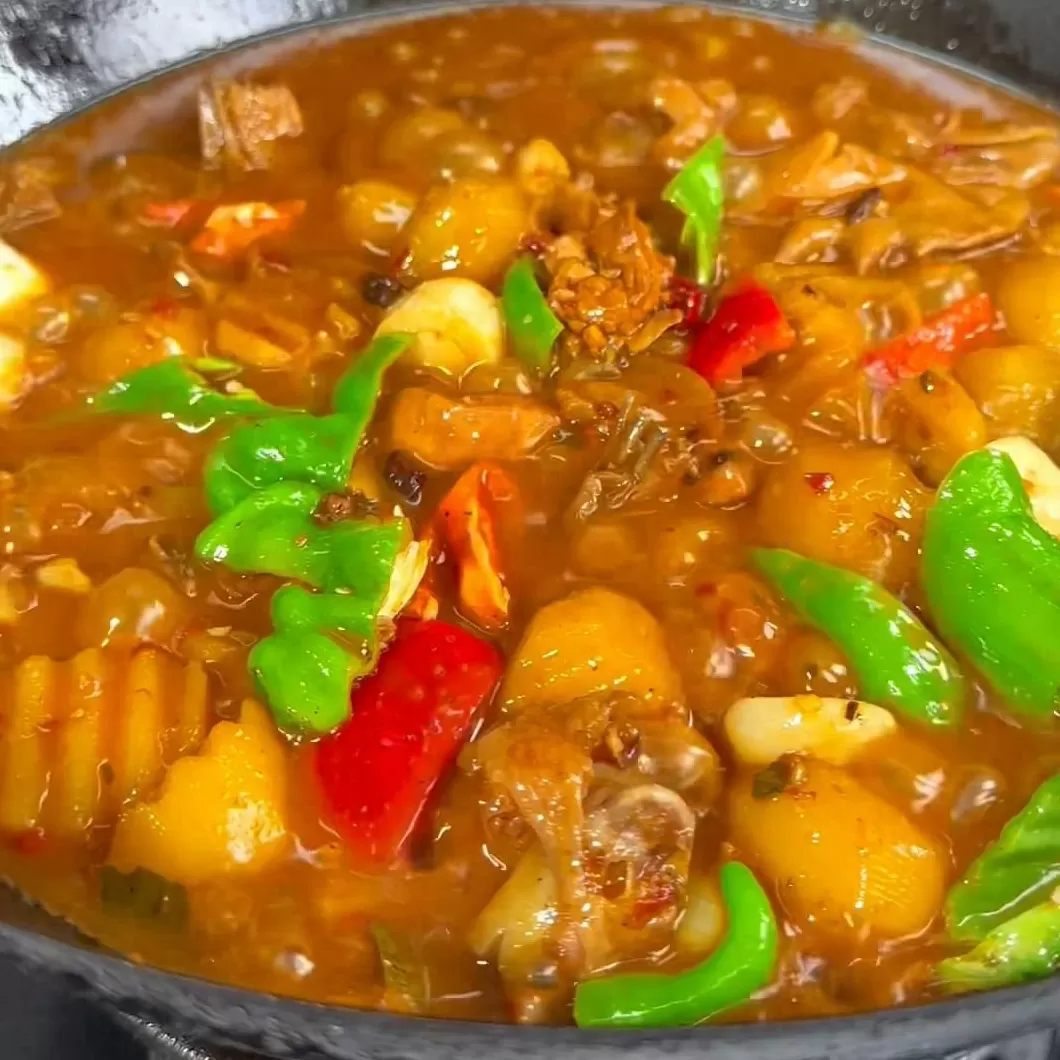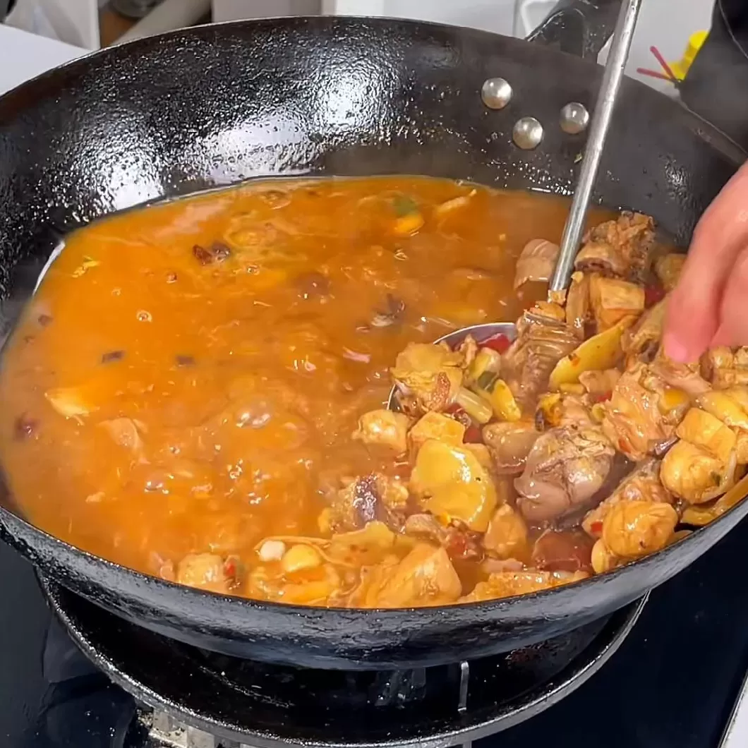 家人们看颜色漂不漂亮?是不是特别的好看?在家里做出土豆烧鸡就这么简单。一包酱料放两斤半到三斤的食材就可以,盐、鸡精什么东西都不要放,非常的简单。学会的家人们自己在家里面做起来超级好吃。