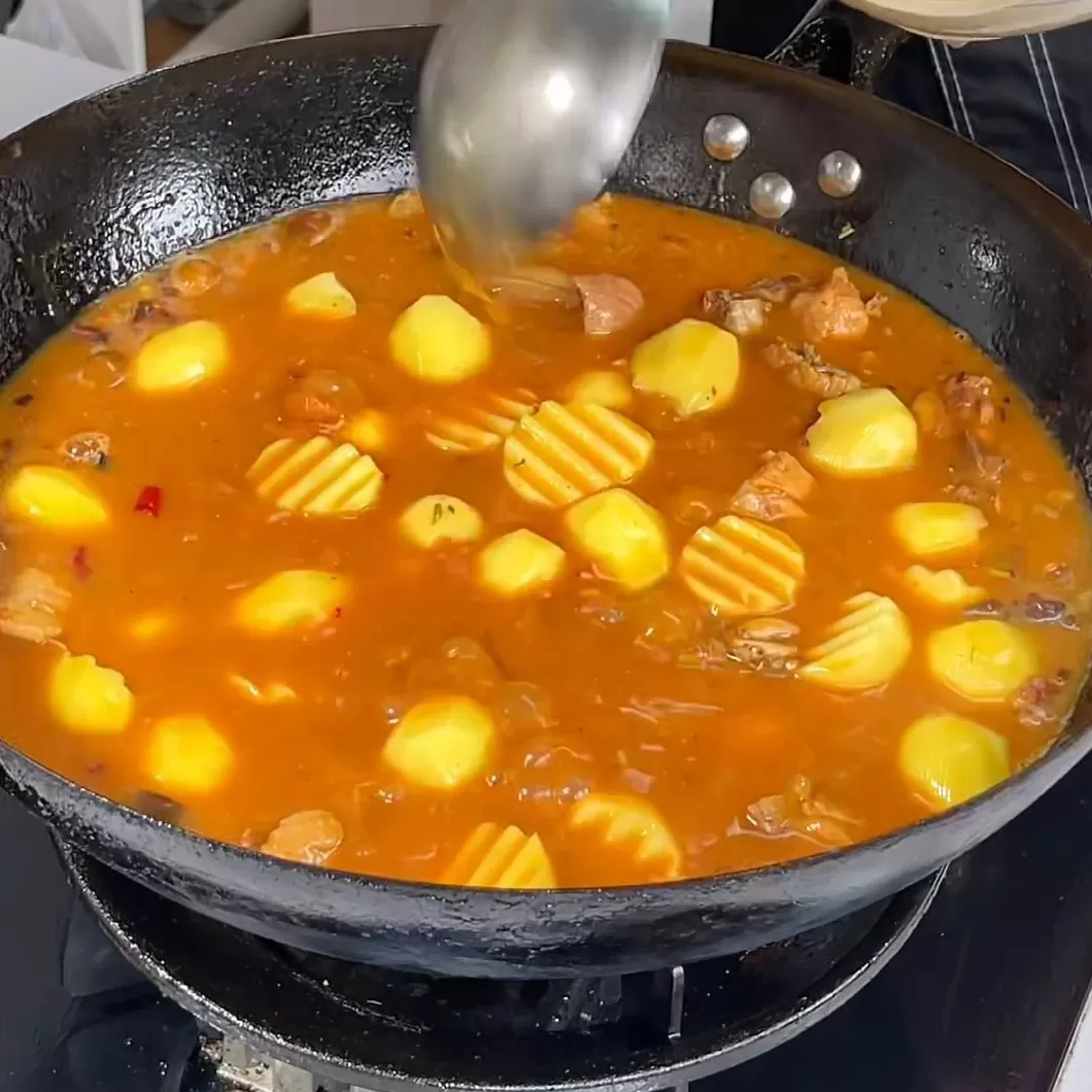 ·再把盖子盖上去,继续烧15分钟就可以了。汤汁看见土豆颜色全部都上来了,汤汁非常的浓、很香。